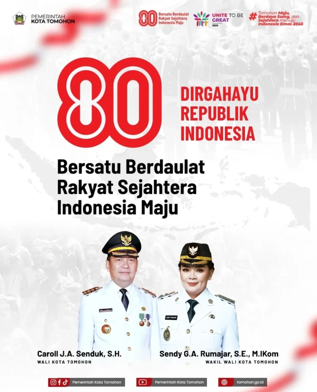 MAESANEWS, TOMOHON – Walikota Tomohon, Caroll Senduk, menyampaikan ucapan selamat Hari Ulang Tahun (HUT) Kemerdekaan Republik Indonesia ke-80 yang jatuh pada tanggal 17 Agustus 2025. Dalam pesannya, Walikota mengajak seluruh masyarakat Tomohon untuk terus menjaga semangat perjuangan, meningkatkan rasa cinta tanah air, dan berkomitmen untuk kemajuan bangsa Indonesia.