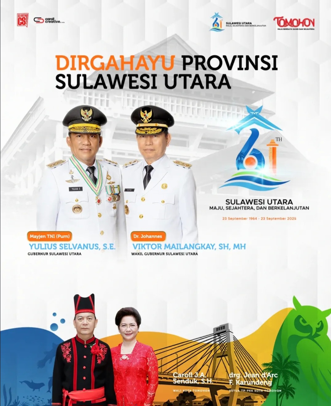 “Atas nama Pemerintah Kota Tomohon dan seluruh masyarakat, kami mengucapkan selamat HUT ke-61 Provinsi Sulawesi Utara. Semoga di usia yang semakin matang ini, Sulawesi Utara semakin maju dalam berbagai bidang, semakin sejahtera masyarakatnya, dan pembangunan yang berkelanjutan terus menjadi prioritas,” ujar Walikota Caroll Senduk.