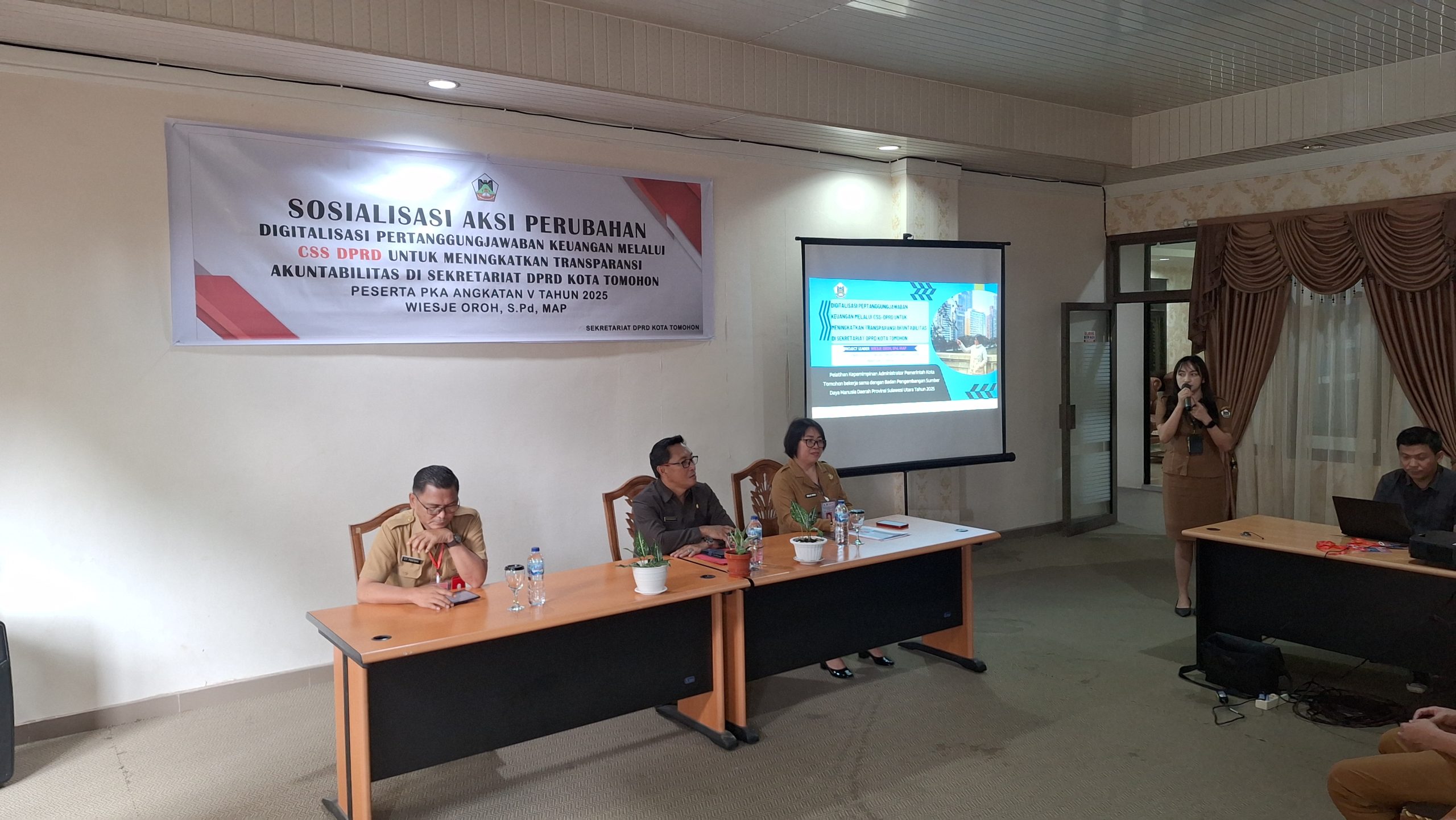 MAESANEWS, TOMOHON – Sekretariat Dewan Perwakilan Rakyat Daerah (DPRD) Kota Tomohon menggelar Sosialisasi Aksi Perubahan Digitalisasi Pertanggungjawaban Keuangan Melalui Program CSS DPRD Untuk Meningkatkan Transparansi Akuntabilitas dilingkup DPRD Kota Tomohon, Selasa (14/10/2025).