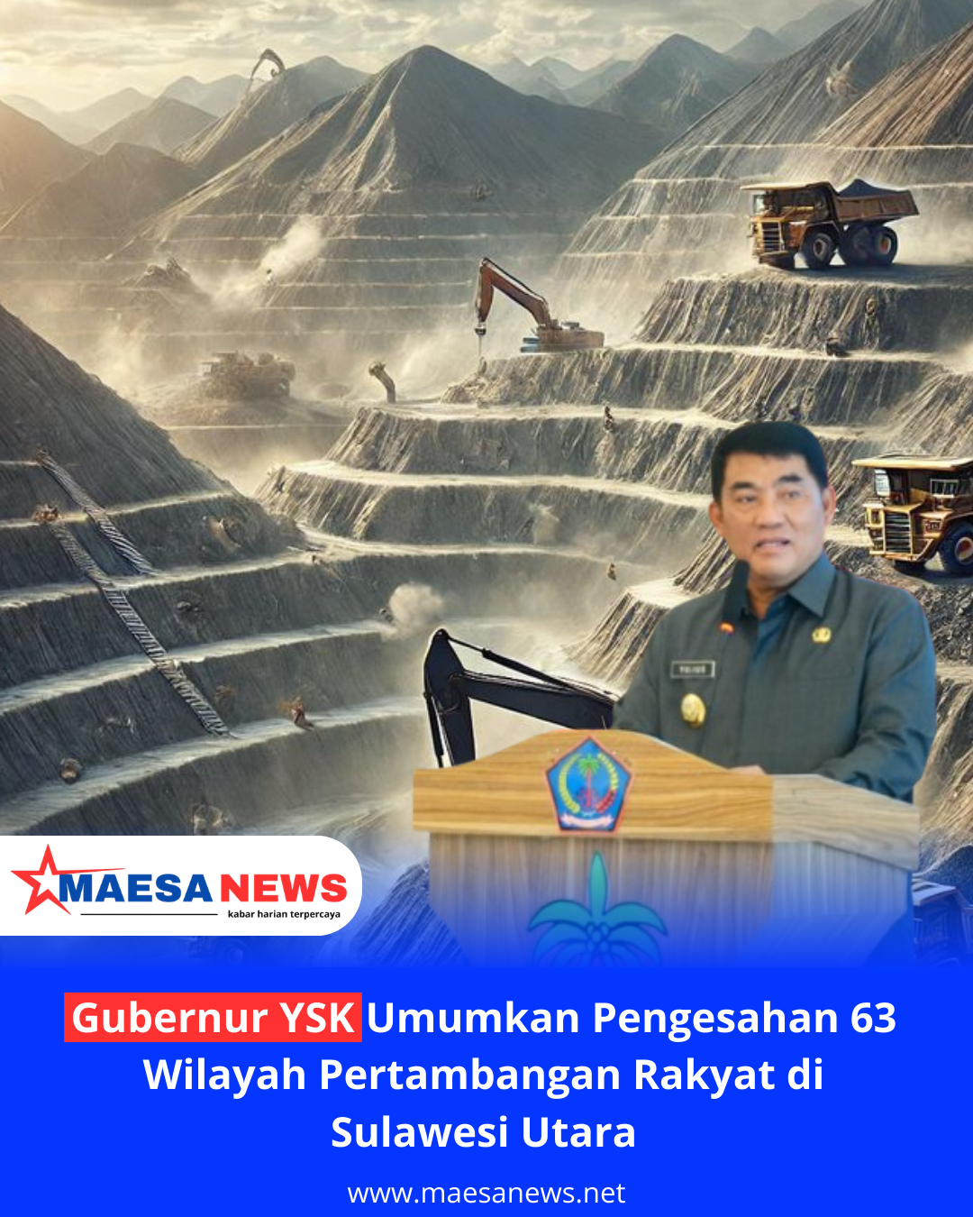 MAESANEWS, MANADO – Pemerintah Pusat akhirnya mengesahkan legalitas penambang rakyat di Sulawesi Utara (Sulut,) setelah melalui perjuangan panjang yang dikawal langsung oleh Gubernur Sulawesi Utara, Yulius Selvanus Komaling (YSK). Keputusan tersebut ditandai dengan diterimanya Surat Keputusan (SK) Menteri Energi dan Sumber Daya Mineral (ESDM) terkait penetapan 63 Wilayah Pertambangan Rakyat (WPR) di Provinsi Sulawesi Utara.